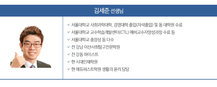 | 1 | 대치동 최고 실력파 김세준 선생님, 각타 선생님의 생활과 윤리& 사회문화 겨울방학 특강 | edufirst | 2015.12.11 |